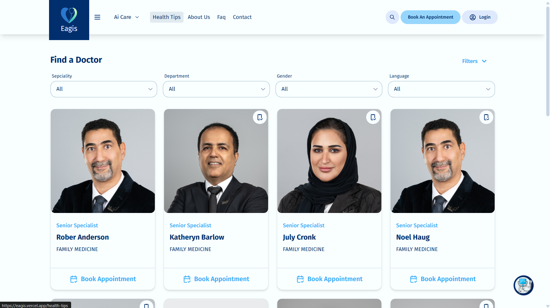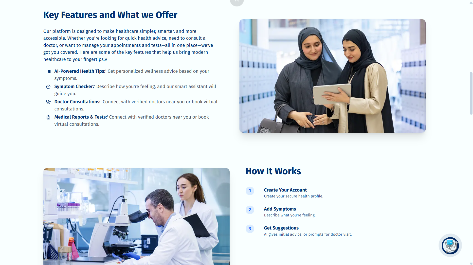 This website is for a digital healthcare platform (and companion mobile app) designed to make healthcare easy, fast, and accessible from one place. It combines AI assistance, doctor consultations, and appointment management into a single system.