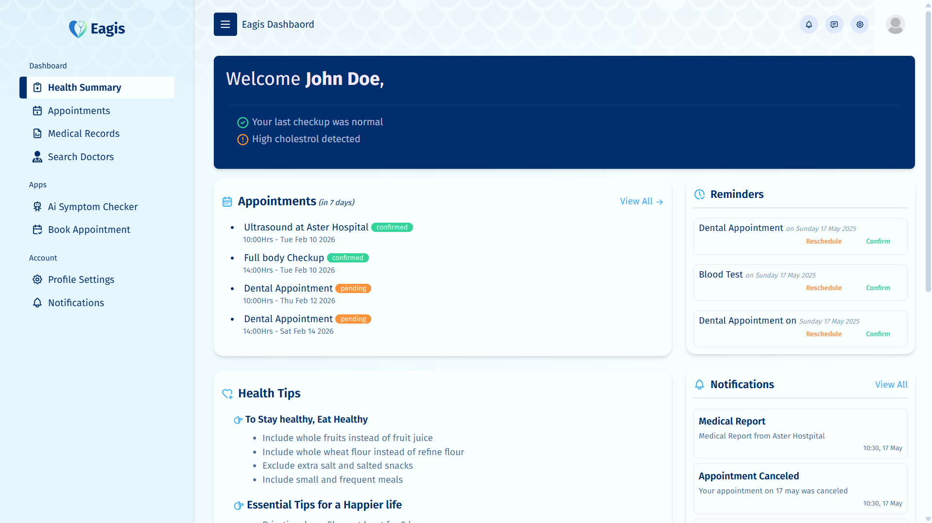 - Medical Reports & Tests: Access prescriptions, reports, and recommended medical tests in one place.