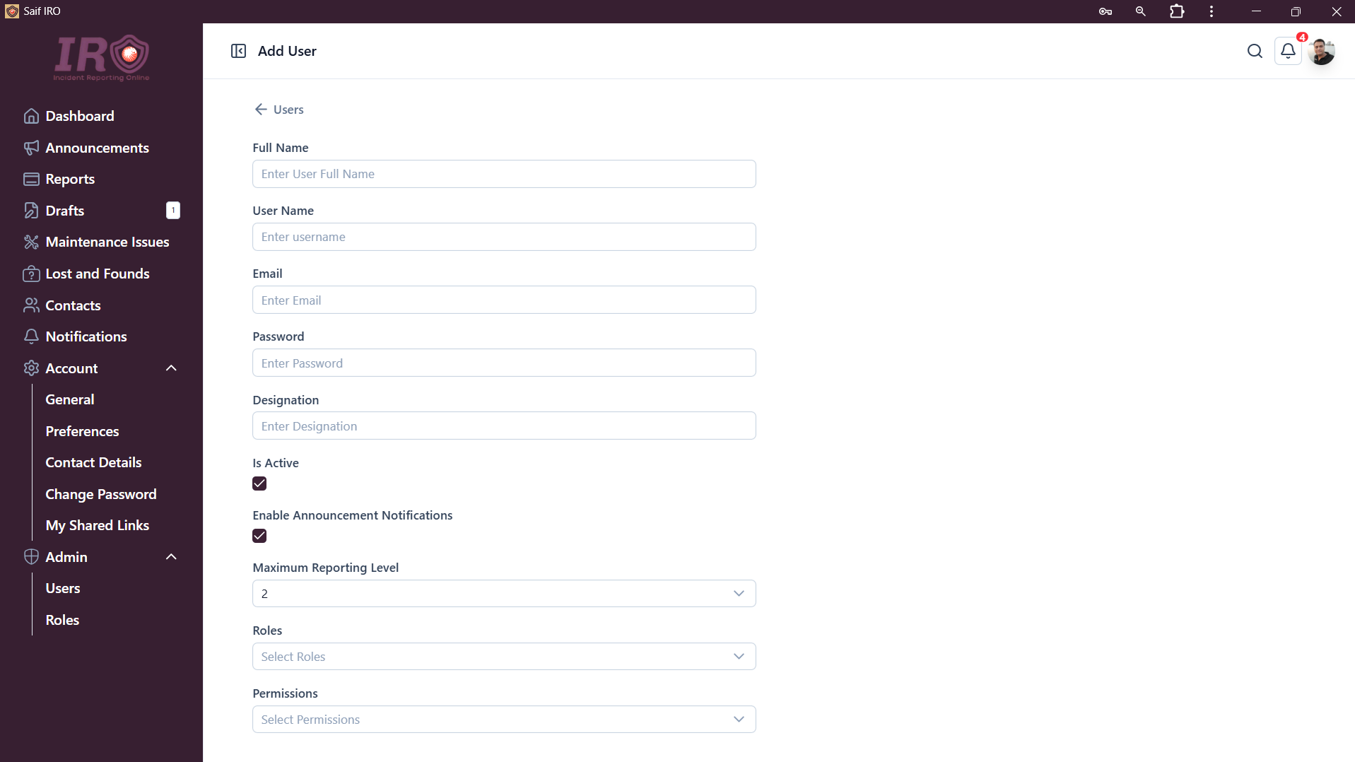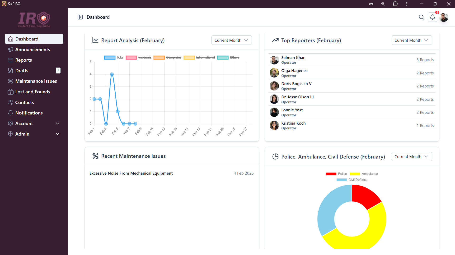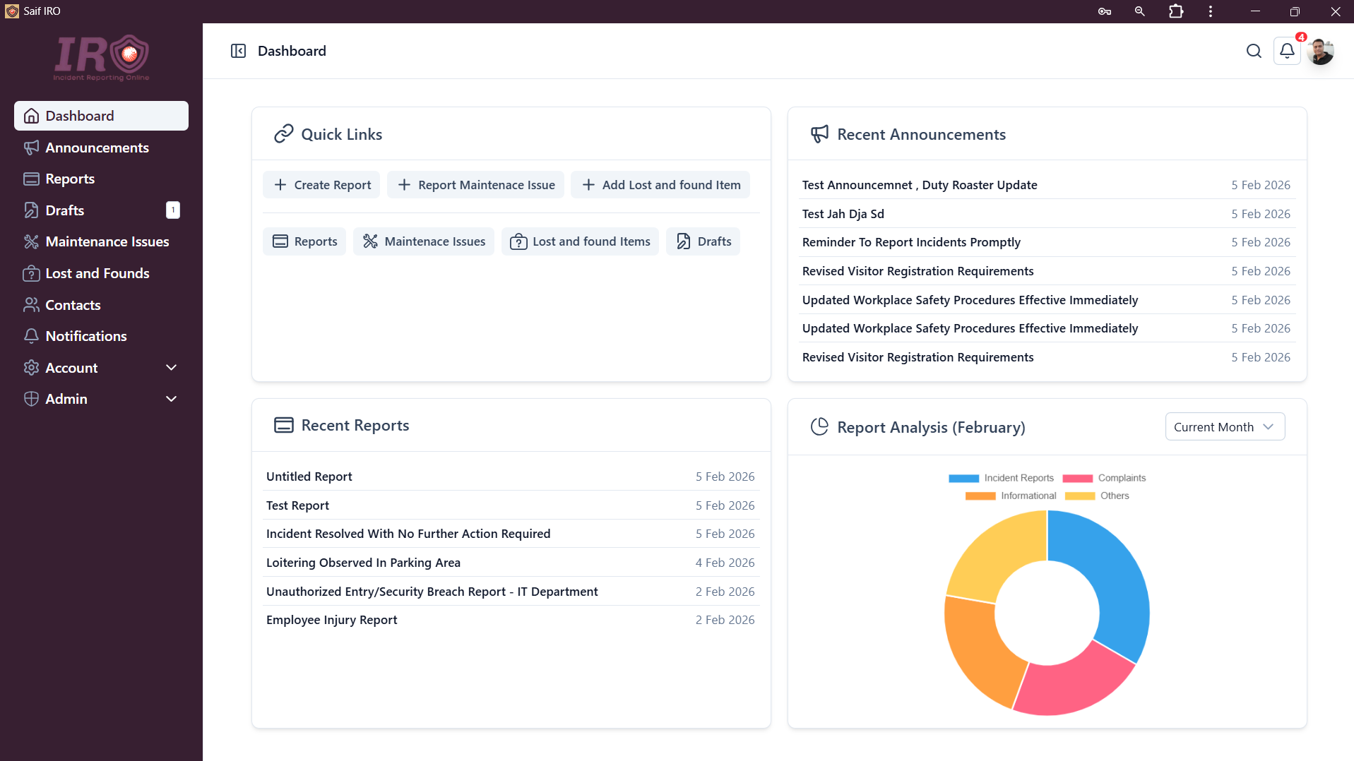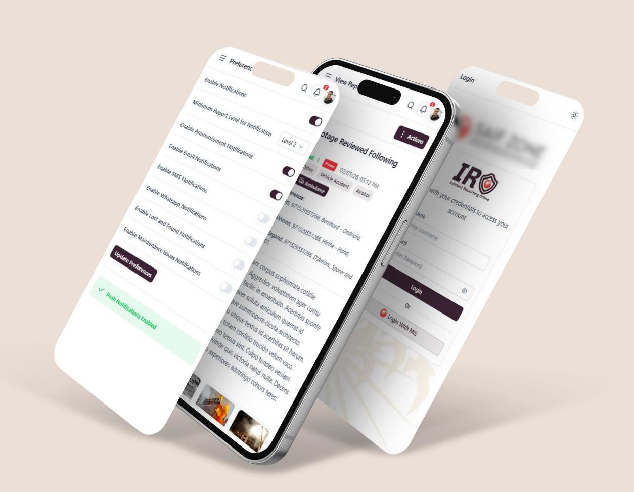 Saif IRO (Incident Reporting Online) is a comprehensive incident and operations management platform designed for organizations that require structured, secure, and hierarchical reporting workflows. The application centralizes incident reporting, announcements, maintenance issues, and lost-and-found tracking into a single system accessible across web, mobile, and desktop platforms.