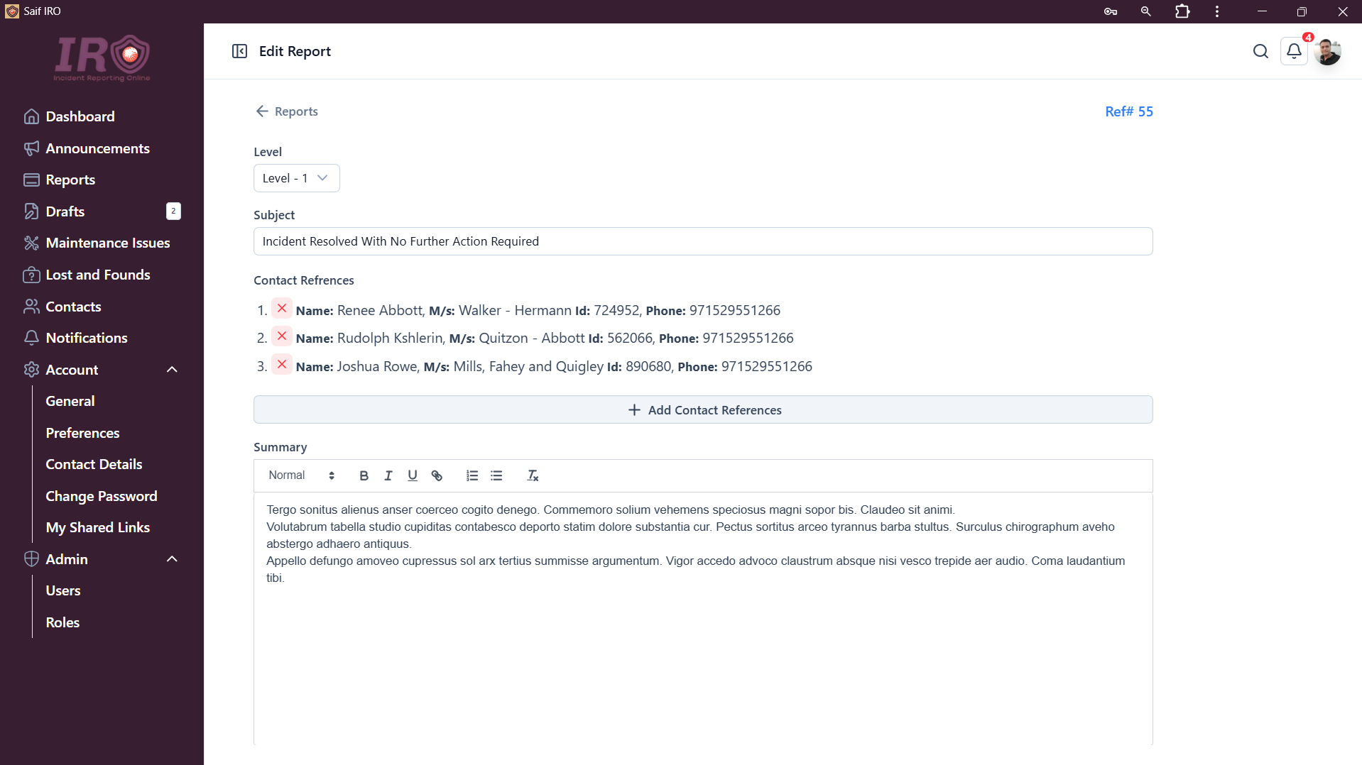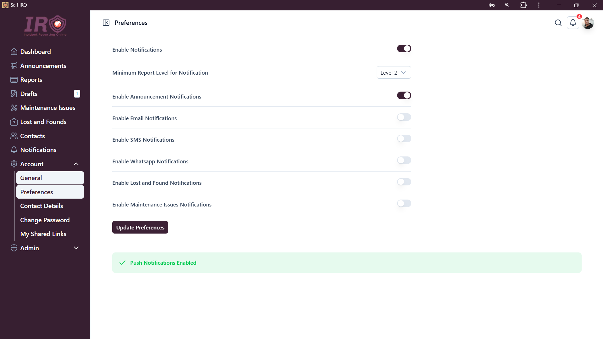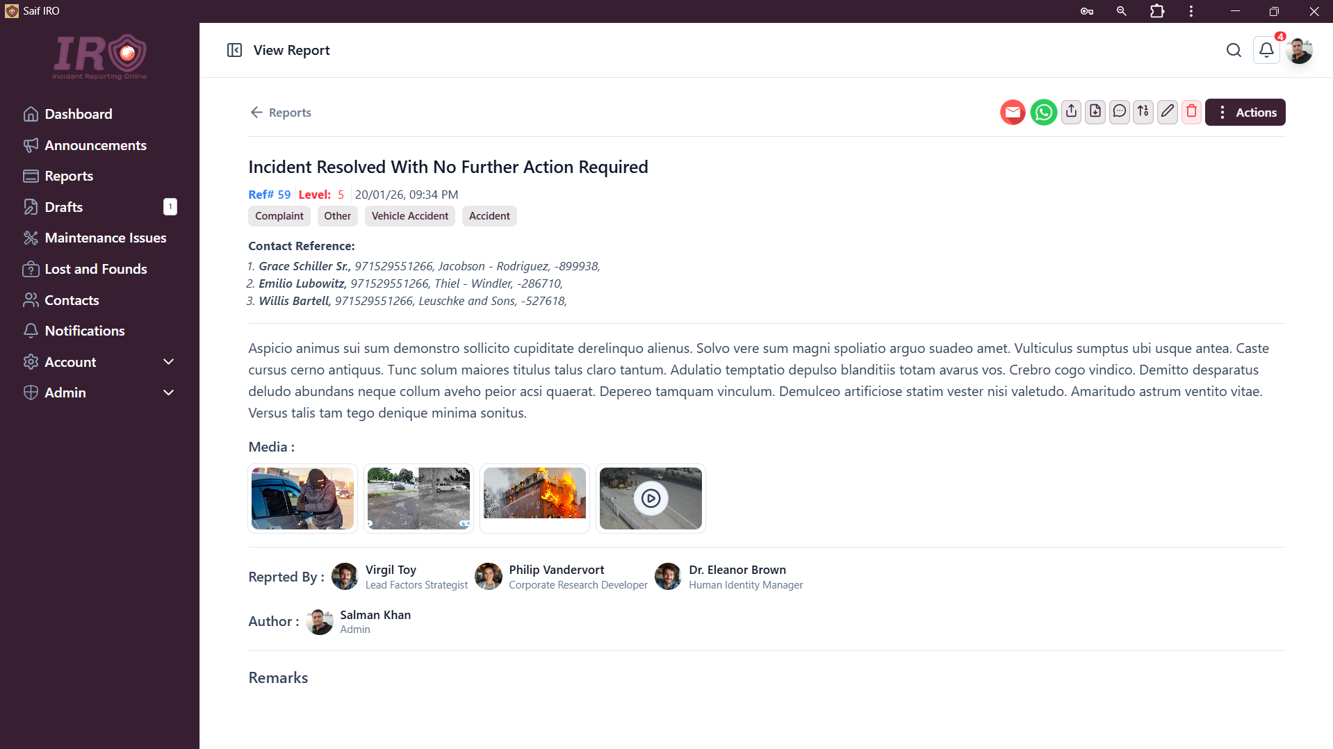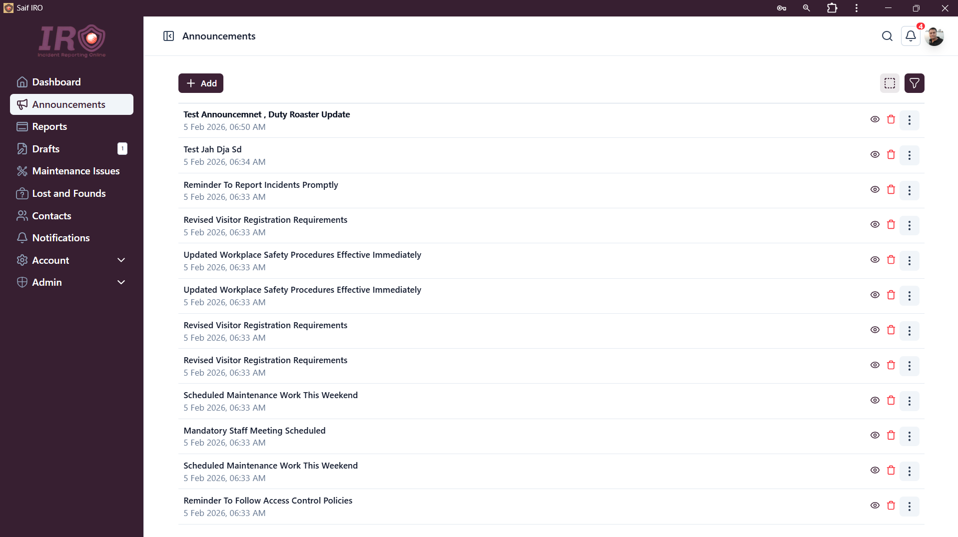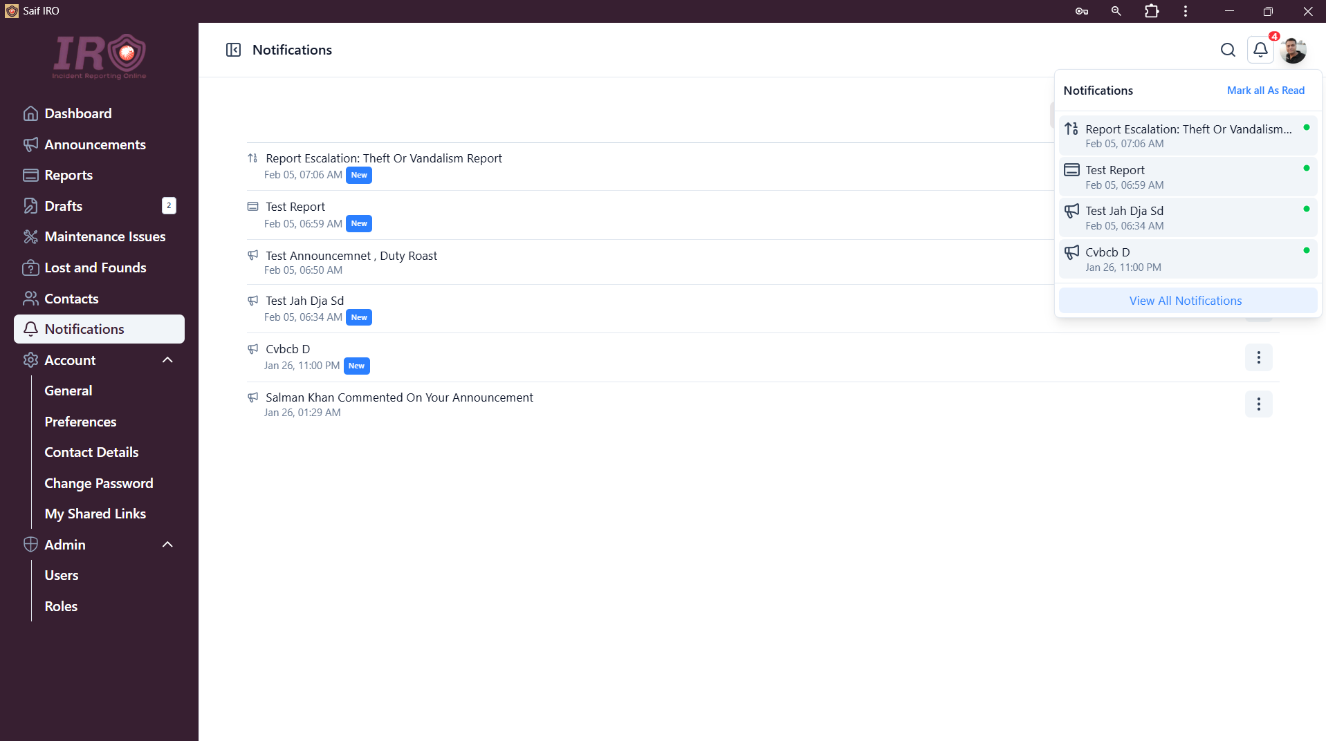 Saif IRO (Incident Reporting Online) is a comprehensive incident and operations management platform designed for organizations that require structured, secure, and hierarchical reporting workflows. The application centralizes incident reporting, announcements, maintenance issues, and lost-and-found tracking into a single system accessible across web, mobile, and desktop platforms.