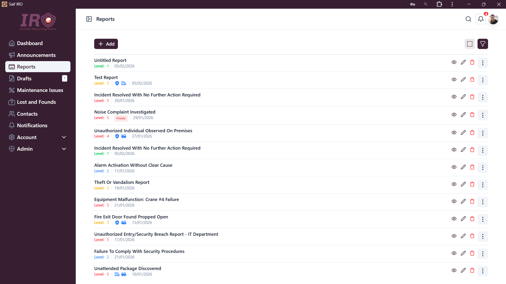 The platform is built around a role-based permission model, ensuring users can only access features and report levels appropriate to their responsibilities. Incidents are categorized by severity levels, with built-in escalation workflows that reflect real-world organizational hierarchies. Supervisors and authorized personnel can review, escalate, and manage reports while maintaining full auditability.