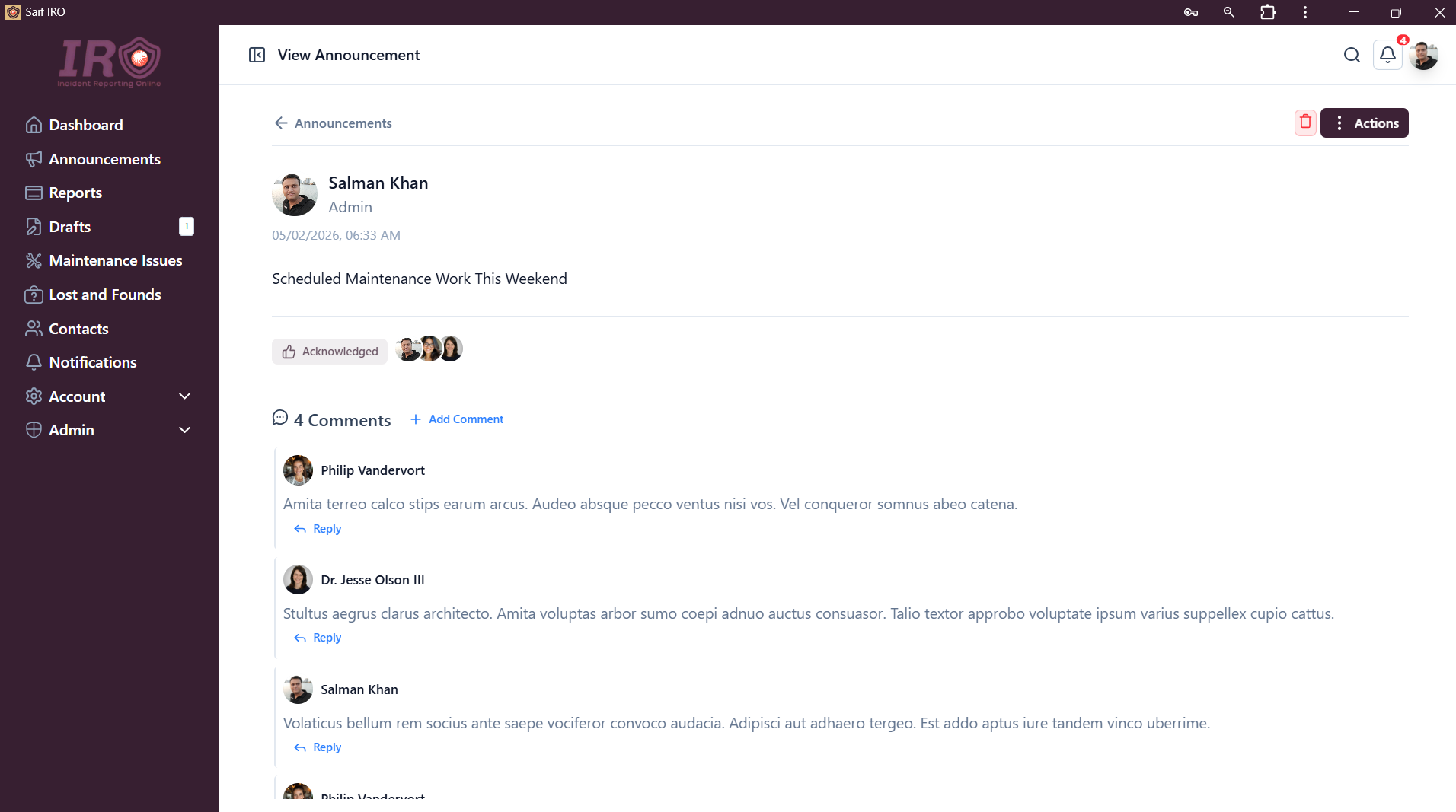Beyond incident reporting, the system supports internal communication through announcements, comments, and mentions, as well as operational workflows such as maintenance issue tracking and lost-and-found management. Together, these features make Saif IRO a robust, enterprise-ready solution for security, facilities, and operations teams.