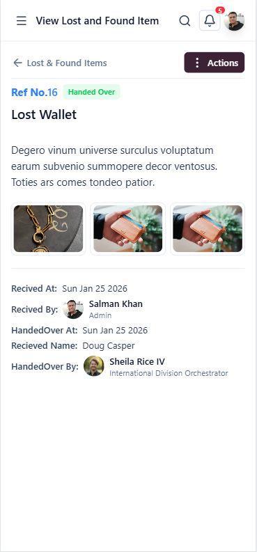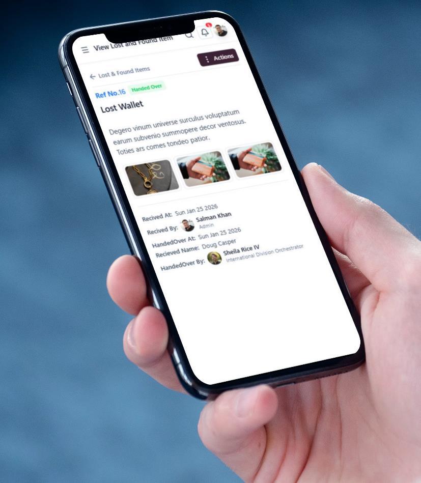 - Update lost and found status when an item is handed over to its owner. The app records who received the item, who handed it over, and to whom.